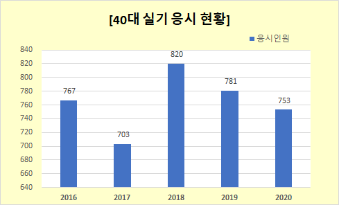- 실기 응시인원은 18년 820명, 19년 781명, 20년 753명으로 전년대비 -28명 감소하였고, 최근 3개년 평균 785명 입니다