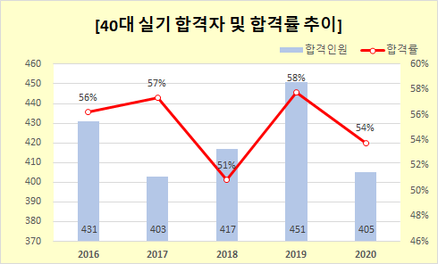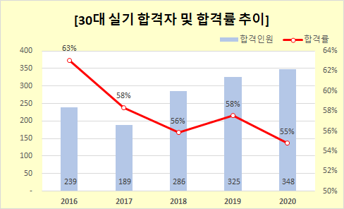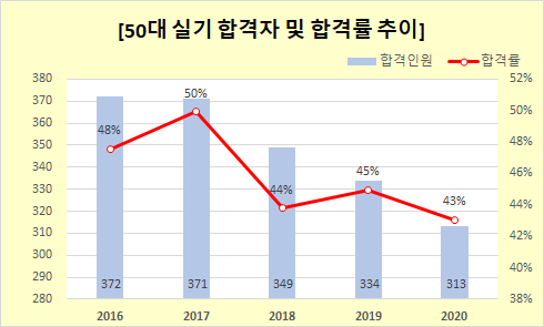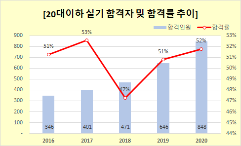 - 실기 합격률은 18년 47.3%, 19년 50.8%, 20년 51.8%으로 전년대비 1.0% 증가하였고, 최근 3개년 평균 50.3% 입니다