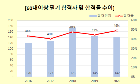 - 필기 합격인원은 18년 175명, 19년 145명, 20년 142명으로 전년대비 -3명 감소하였고, 최근 3개년 평균 154명 입니다