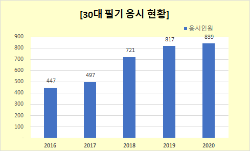- 필기 응시인원은 18년 721명, 19년 817명, 20년 839명으로 전년대비 22명 증가하였고, 최근 3개년 평균 792명 입니다