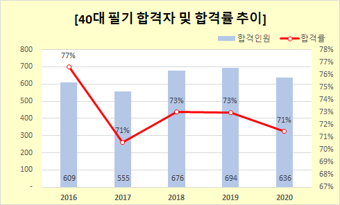 - 필기 합격인원은 18년 676명, 19년 694명, 20년 636명으로 전년대비 -58명 감소하였고, 최근 3개년 평균 669명 입니다