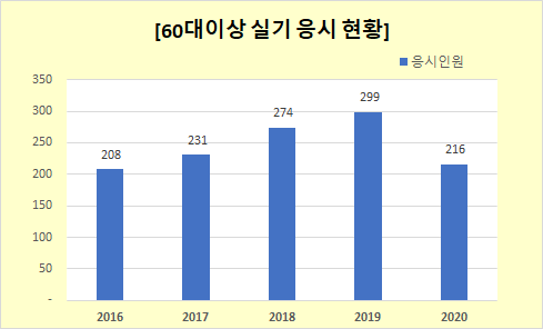 - 실기 응시인원은 18년 274명, 19년 299명, 20년 216명으로 전년대비 -83명 감소하였고, 최근 3개년 평균 263명 입니다