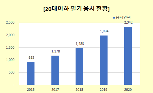 - 필기 응시인원은 18년 1,483명, 19년 1,984명, 20년 2,342명으로 전년대비 358명 증가하였고, 최근 3개년 평균 1,936명 입니다