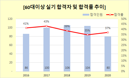 - 실기 합격률은 18년 38.7%, 19년 34.8%, 20년 37.0%으로 전년대비 2.3% 증가하였고, 최근 3개년 평균 36.8% 입니다