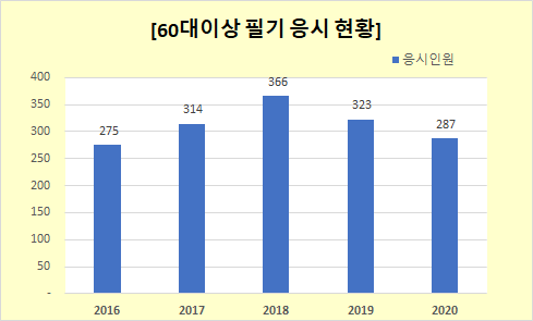 - 필기 응시인원은 18년 366명, 19년 323명, 20년 287명으로 전년대비 -36명 감소하였고, 최근 3개년 평균 325명 입니다